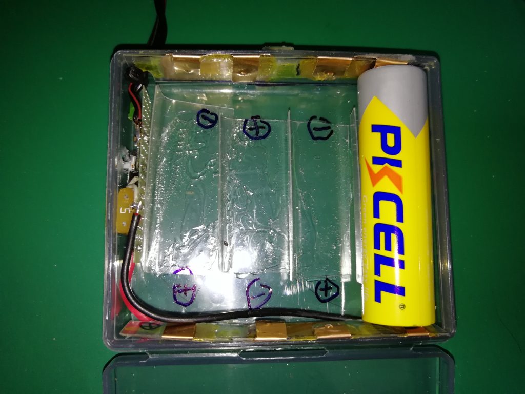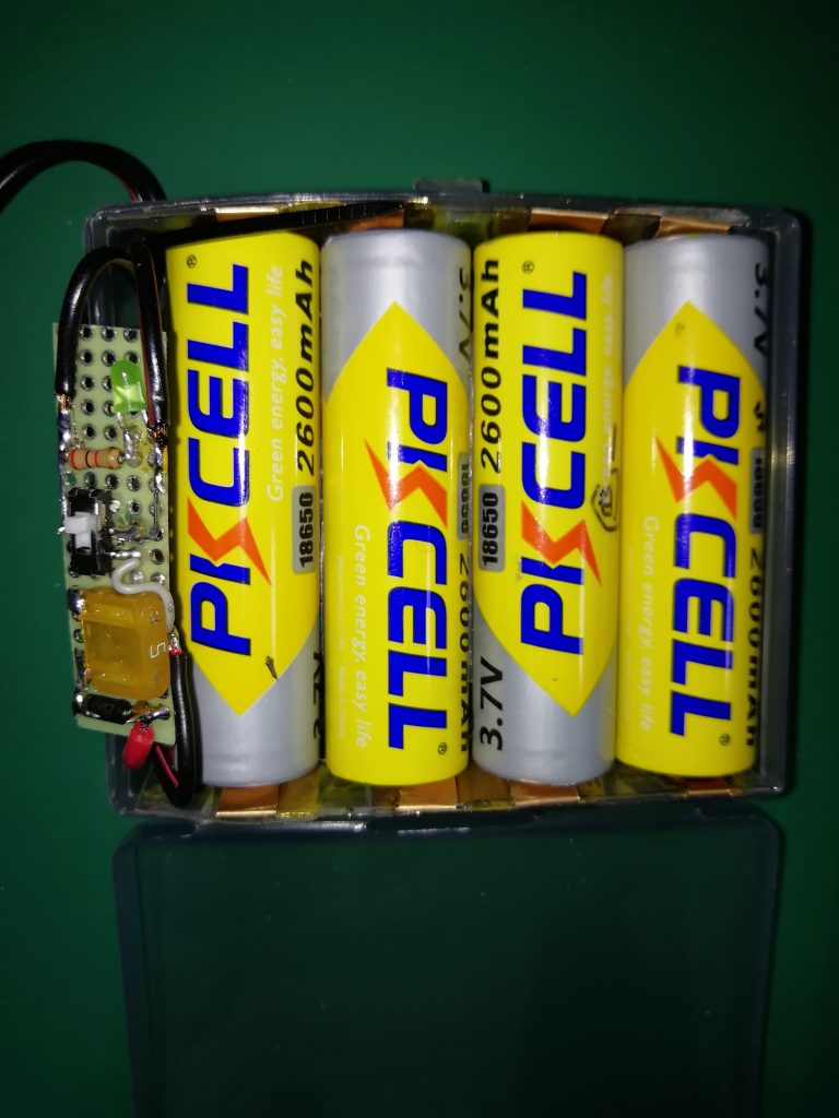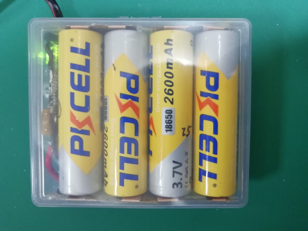 外部バッテリーパック作成by jm1wijに ALL、batteryon 投稿日: 2023年2月21日2026年3月28日 2023年2月21日 長時間POTA運用する為に18650リチウムイオン電池4本の外部バッテリパックを作成しました。 ダイソーで18650リチウムイオン電池に合うケースを見つけました 100円で2個のケースが使えます 千石電商で入手した18650電池を入れてみました。ピッタリです。 適当な材料を使って電池の仕切り版を作ります 薄い銅板をハサミで切って電極を作ります 仕切り版と電極銅板をボンドで貼り付けます 簡単な回路、ヒューズ、ダイオード、スイッチ、LEDを基盤に取付けました 中身はこんな感じでになります 動作確認、緑色のダイオードが光れば配線は問題無しです 電圧をチェック トランシーバに接続してパワーチェック、約5W出てます 横から見た電池パック、電源SWの穴は大雑把です 充電は別の汎用充電器で行います PATA運用、最初の頃のスタイルです