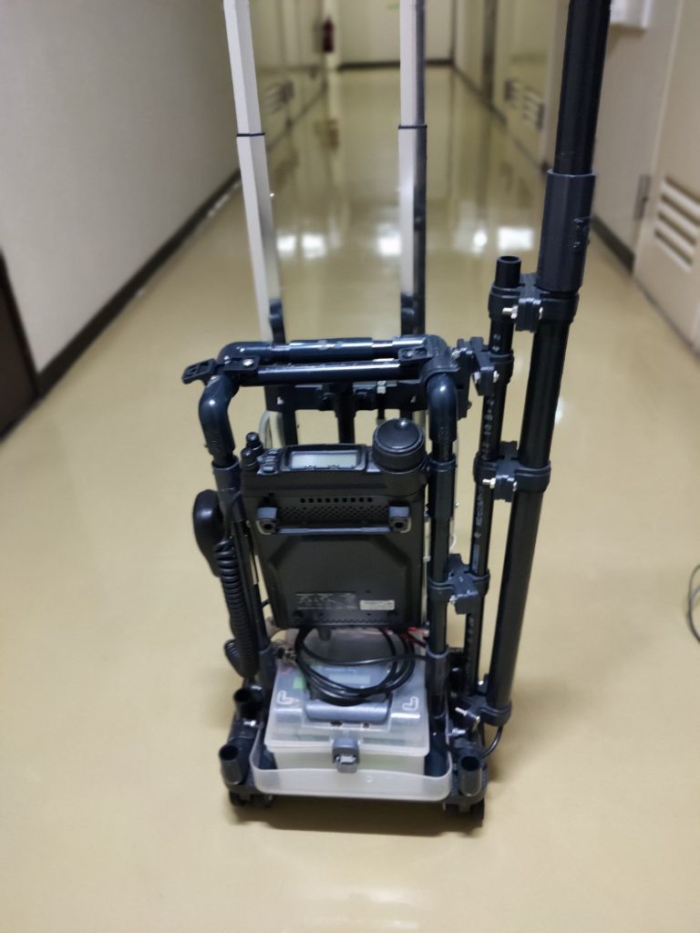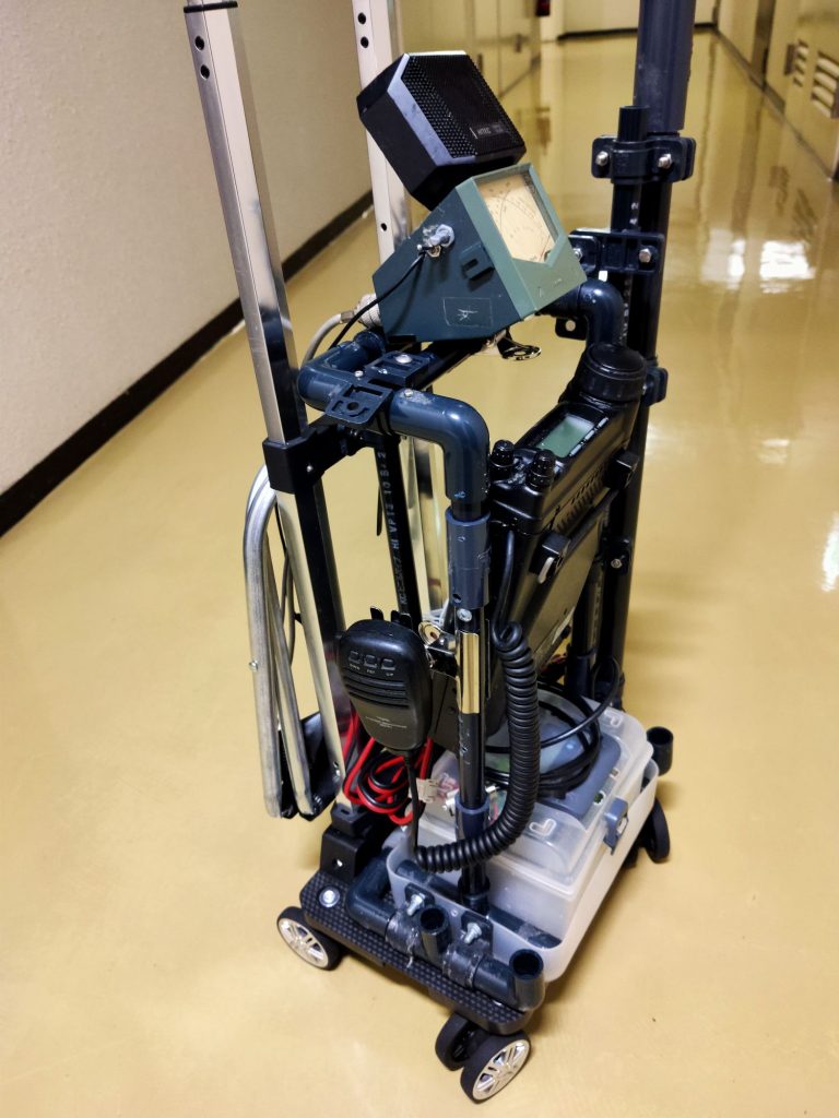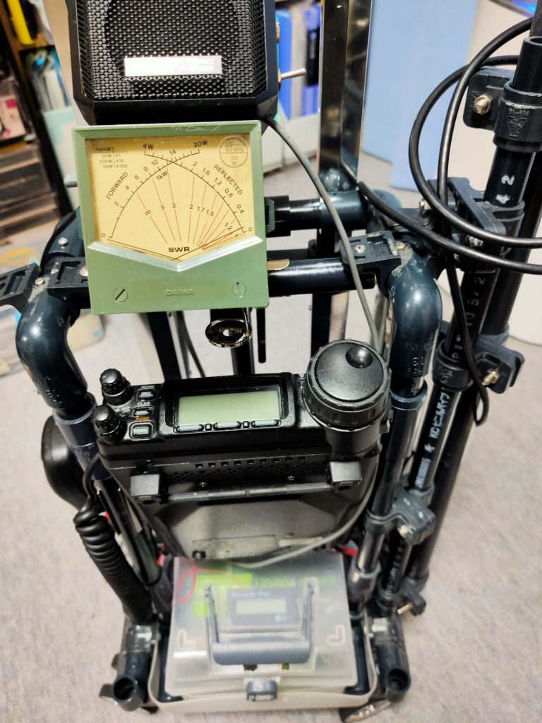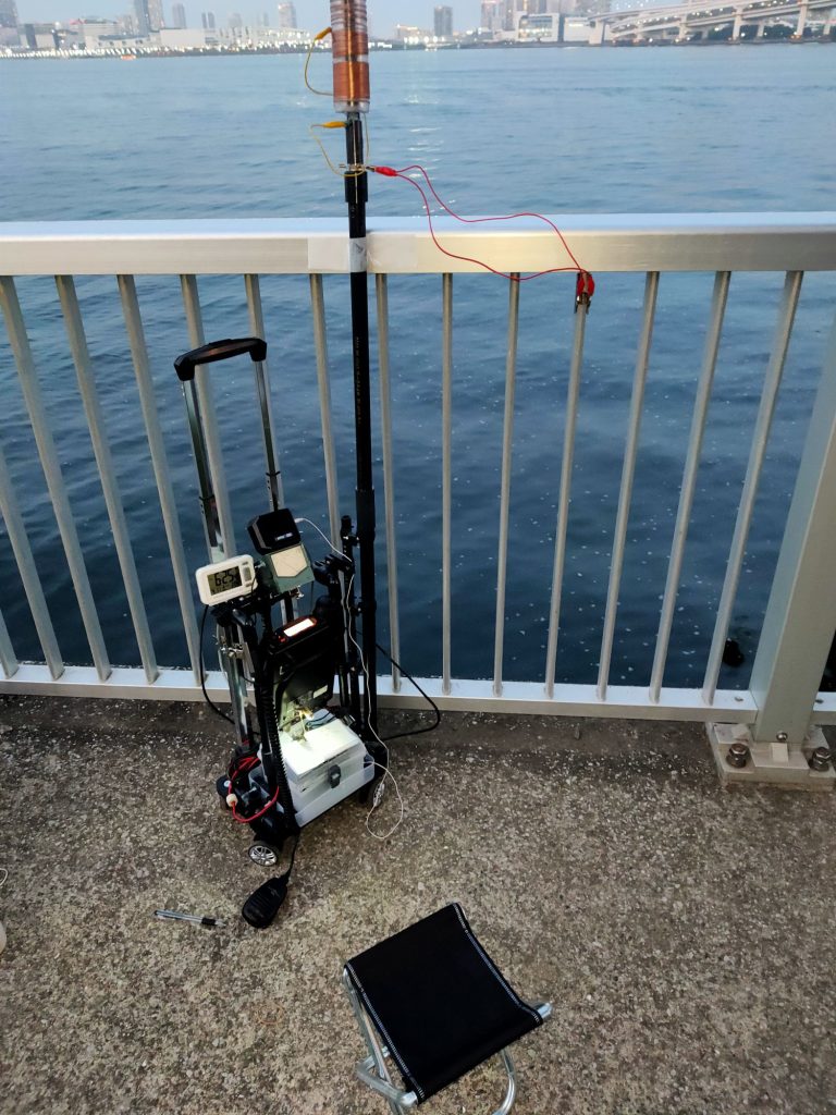 POTA_HF移動運用カート改良by jm1wijに ALL、antenna、battery、POTAon 投稿日: 2026年4月11日2026年4月12日 2026年4月11日 大島移動は強風で船が欠航となったので、先日作成したHF移動運用のカートの問題点の改善を行いました。 ちょっと分かり難いですが、リグの位置をを少し高くして、バッテリーを取り出し易くしました。またメーターの取付バーを追加して、メータを外したら物を載せられるようにしました 後ろから見ると、メータの取付パイプの後ろのパイプをカートに密着させました。また折り畳み椅子を取付けて運べるようにしました。 メータを取り外すとリグの上のパイプがフラットになるので、バックを載せる事が出来ます。またカバーを養生の材料で作成しました。 メータを付けた状態 メータを外した状態、リグの上のパイプがフラットになります これでカバーを付けてバックを載せる事が出来ます。旅行用スーツケースみたいになります 無地だとテープばかりで見苦しいのでA4で印刷シートをクリアファイルに入れてテープ止めしました これでスーツケースと同じ様にバックを載せて移動が出来ます 今日は芝浦南ふ頭公園まで移動して運用してみました 芝浦南ふ頭公園から運用中、手すりをアース代わりにしてSWRが下がりました。7MHzの通信テストも上々でした。